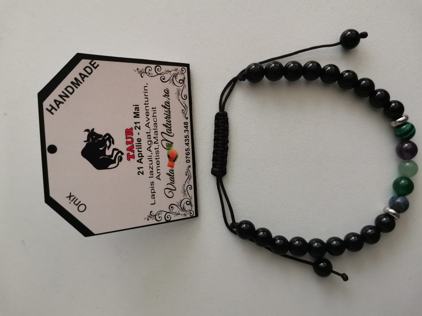 Bratara impletita zodia taur cu onix si 5 pietre semipretioase caracteristice zodiei (Lapiz lazuli, Agat, Aventurin, Ametist, Malachit).