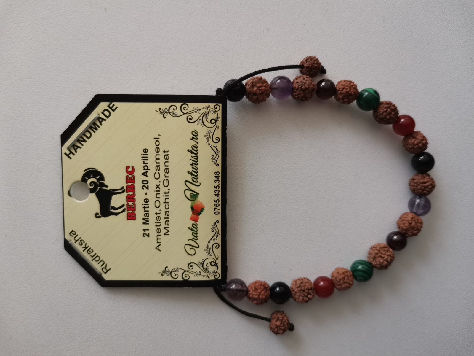 Bratara impletita zodia berbec cu rudraksha si pietre semipretioase caracteristice zodiei (Ametist, Onix, Carneol, Malahit si Granat).